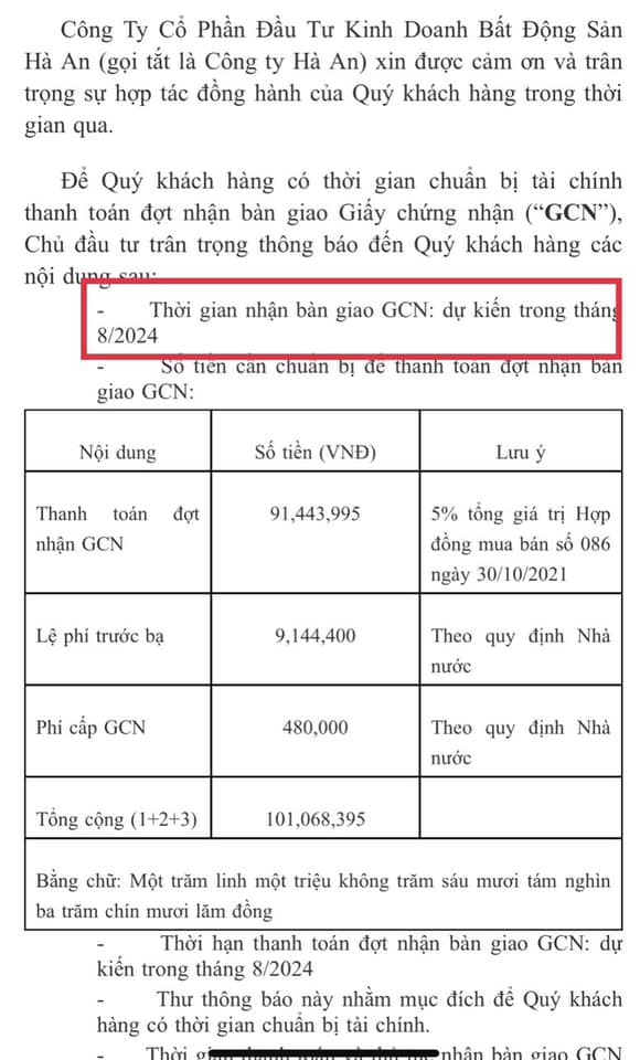 Hiện chủ đầu tư cũng đang thông báo bàn giao theo trình tự cho khách hàng trong tháng 8/2024