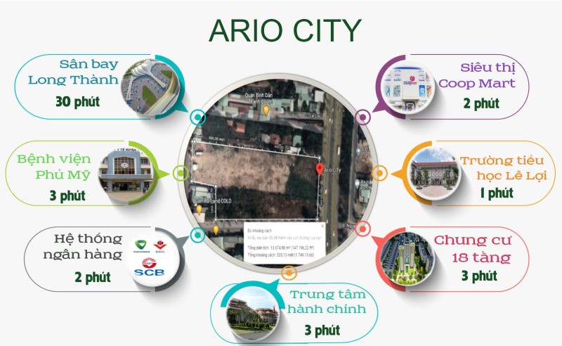 Dự án Ario nằm ngay mặt tiền quốc lộ 51 đối diện với siêu thị Coopmart Phú Mỹ. Sát cạnh bên khách sạn Gold Hotel Phú Mỹ. Sát bên KNG Phú Mỹ, trung tâm thị xã Phú Mỹ,… rất nhiều công trình trọng điểm của thị xã.