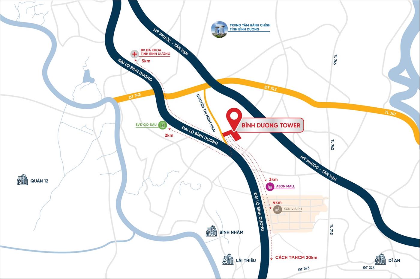 Từ vị trí của dự án có thể dễ dàng kết nối đến các khu công nghiệp, cụm công nghiệp lớn nhất Bình Dương như VSIP – Đồng An – Việt Hương; đồng thời hội tụ đầy đủ hệ thống tiện ích chuẩn quốc tế như trung tâm thương mại, trường quốc tế các cấp, bệnh viện quốc tế, công viên trung tâm,… chỉ trong bán kính 5km. Đặc biệt là dự án nằm ngay cửa ngõ của Trung tâm hành chính tỉnh Bình Dương giúp gia tăng giá trị rất lớn cho Bình Dương Tower.