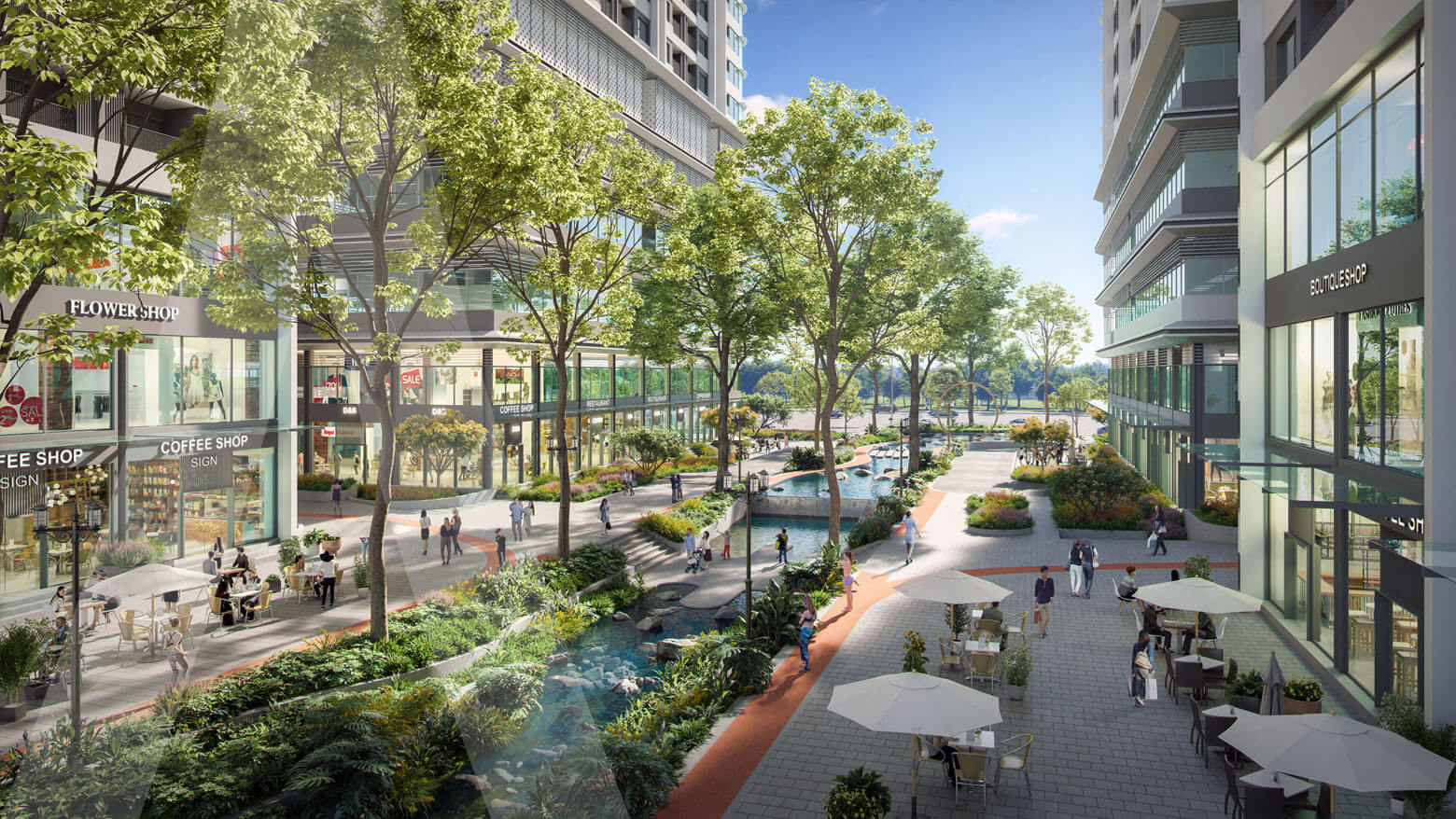 Hơi thở thiên nhiên rộng mở tinh tế: Với thiết kế phân tầng cao độ, cảnh quan tại Boulevard Royale mở ra tầm nhìn thoáng rộng, hài hòa giữa mỹ quan và công năng phục vụ. Chuỗi tiện ích được đan cài giữa những mảng xanh, xóa mờ khoảng cách giữa nhân tạo và tự nhiên. Dọc theo dòng suối nhiệt đới dài 300m, các tiện ích và cảnh quan được kết nối xuyên suốt mang đến không gian xanh tiện nghi và thư giãn.