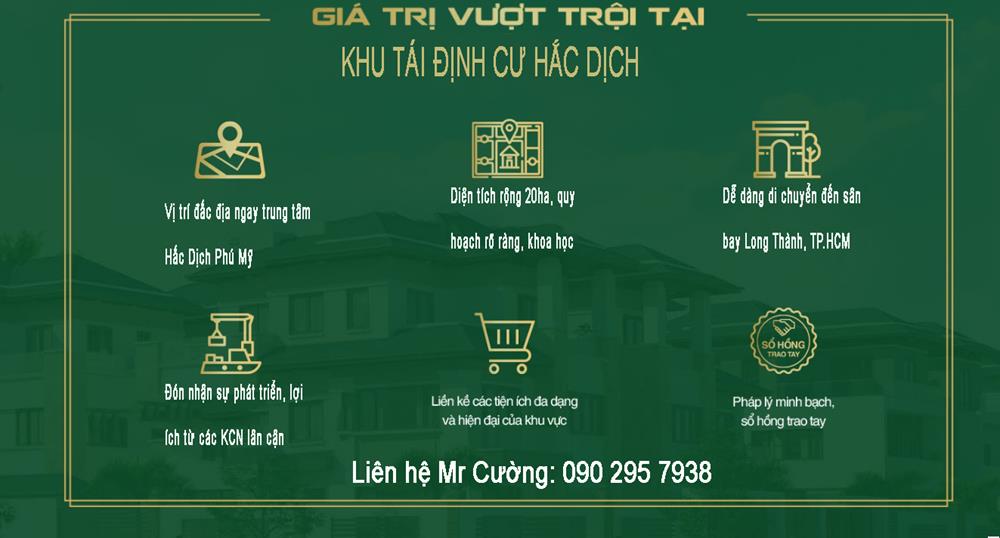 Tái định cư Hắc Dịch một dự án đất nền có vị trí ngay trung tâm phường Hắc Dịch Thị xã Phú Mỹ. Với quy mô lên đến 20ha, các phân lô rõ ràng hợp lí khoa học. Thị xã Phú Mỹ hiện nay đang là mục tiêu đầu tư, phát triển của nhà nước. Trung tâm kinh tế trọng điểm của tỉnh Bà Rịa Vũng Tàu. Với chủ trương trở thành một thành phố vệ tinh của TP.HCM. Thu hút nhiều nhà đầu tư, tập đoàn lớn trên toàn quốc. Kể đến như tập đoàn VinGroup với dự án 800ha, tập đoàn Đất Xanh, Kinh Bắc,…