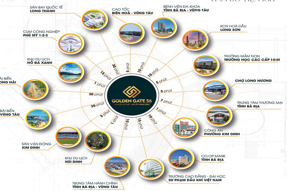 Dự án Golden Gate có tiện ích ngoại khu cực kì phong phú. Từ những tiện ích phục vụ đời sống cơ bản như trường học, bệnh viện, trung tâm hành chính,.. Đến những tiện ích cao cấp như siêu thị, khu mua săm, Khu du lịch, cận kề KCN Long Hương.