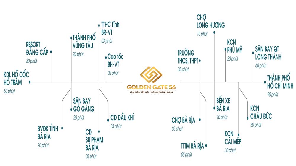 Thông qua hệ thống hạ tầng đường bộ hiện đại của quốc lộ 56, từ dự án Golden Gate dễ dàng đi đến những khu vực quan trọng bậc nhất của toàn tỉnh. Thậm chí di chuyển đến những thành phố lớn các tỉnh lân cận chỉ mất rất ít thời gian.