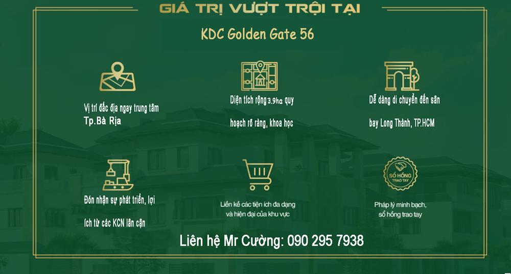 Dự án đất nền Golden Gate 56 có tổng diện tích 3.9ha, lên đến 224 lô đất nền. Nằm tại phường Kim Dinh, một phường có tỉ lệ phát triển cao nhất toàn TP.Bà Rịa. Nằm ngay ngã ba Lê Đại Hành và quốc lộ 56, tuyến quốc lộ chạy dọc Bà Rịa Vũng Tàu. Không chỉ có lợi thế to lớn về mặt vị trí trung tâm TP.Bà Rịa, mà còn dễ dàng giao thông đến các khu vực.