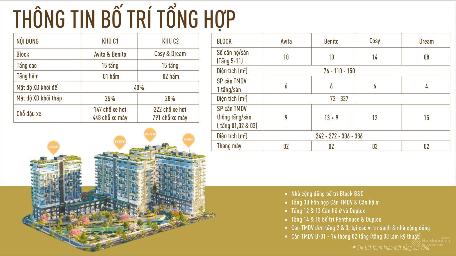 Tầng hầm: Bãi đổ xe Tầng 1 – 3: Trung tâm thương mại Tầng 4: Căn hộ thương mại Tầng 5 – 6: Duplex Villa Tầng 7 – 13: Chung cư cao cấp Tầng 14 – 15: Penthouse 2 Phòng ngủ: 80m2 – 87m2: 252 căn hộ 3 phòng ngủ: 109m2 – 112m2: 56 căn hộ Duplex: 140m2 – 147m2 – 152m2: 54 căn hộ Penthouse: 212m2 – 277m2 – 297m2: 21 căn hộ Shophouse: 166m2 – 235m2 – 267m2 – 305m2 – 335m2: 60 căn |