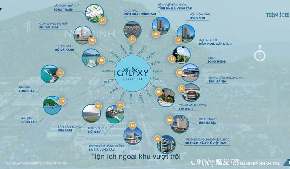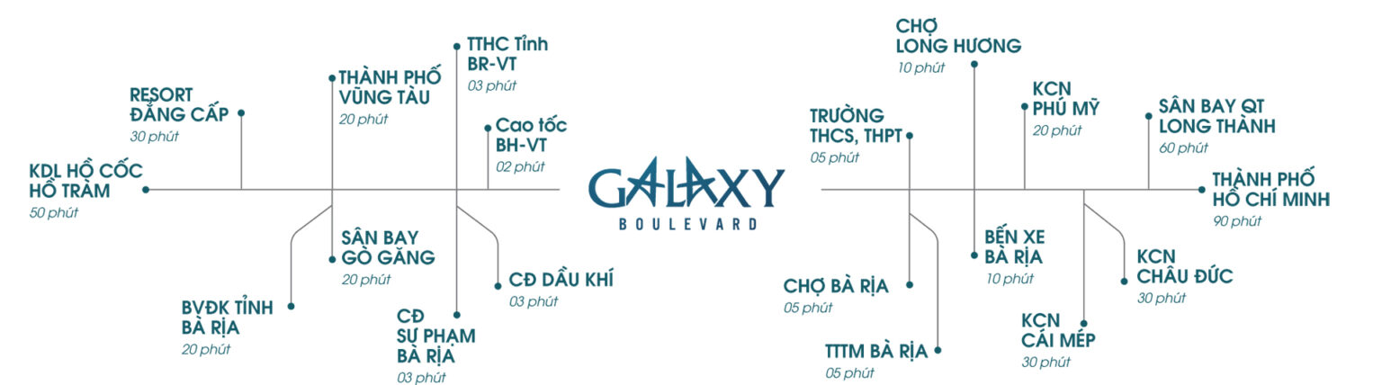 - Từ dự án Galaxy Boulevard Có thể di chuyển đến các nơi sau đây với thời gian dưới 5 phút: Núi Dinh, Hồ Đá Xanh, trung tâm hành chính Tp.Bà Rịa, tất cả các cấp trường học, Chợ Bà Rịa, TTTM,..