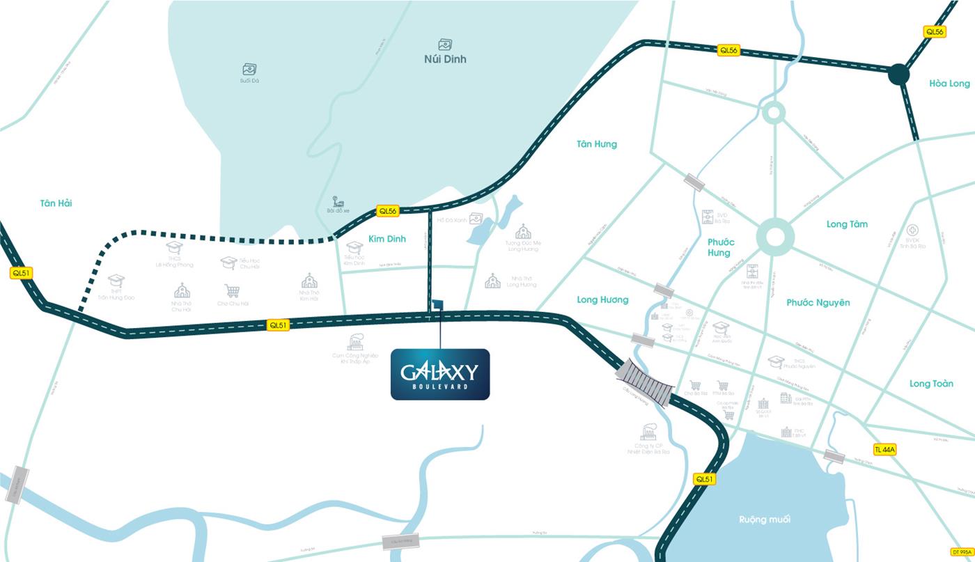 Sở hữu vị trí đắc địa dự án Galaxy Boulevard Bà Rịa nằm ngay trung tâm khu du lịch đỉnh cao của TP.Bà Rịa là Khu du lịch Núi Dinh và hồ Đá Xanh. Cộng với mặt tiền được bao bọc bởi 2 tuyến đường huyết mạch giao thương với các Thành phố lớn trong khu vực nam bộ. Quốc lộ 51và quốc lộ Lê Đại Hành đảm bảo cho sự tiềm năng và khả năng sinh lời của dự án.