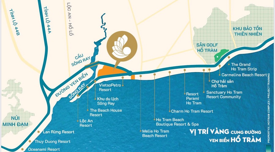 Điều đáng giá nhất của vị trí dự án là năm ngay trung tâm các công trình Hồ Tràm. Gồm các khu resort nổi tiếng như. Lộc An resort, Charm Ho Tram, Ho Tram Beach, khu du lịch Sông Ray,.. Cũng như mang đến các tiện ích ngoại khu tiện nghi.