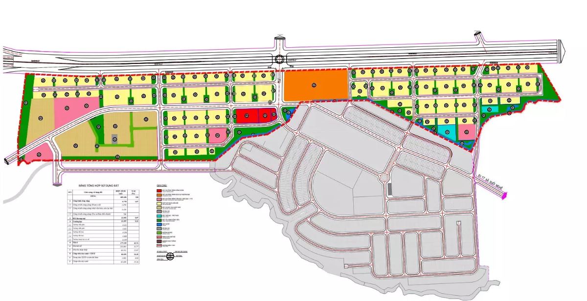 1288 nền nhà liền kề, 2 toà nhà chung cư có diện tích 39000 m2Diện tích các công trình công cộng 20700m2 Diện tích giao thông, cảnh quan tổng cộng 50350 m2 |