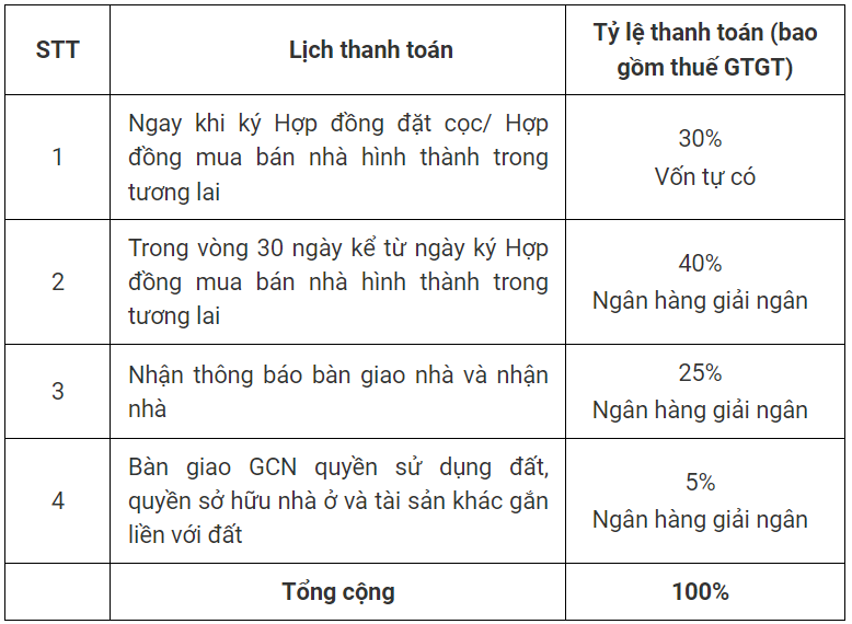 - Điều kiện áp dụng: Khách hàng phải thanh toán tối thiểu 30% bằng vốn tự có trong đợt thanh toán đầu tiên theo tiến độ thanh toán sau:
