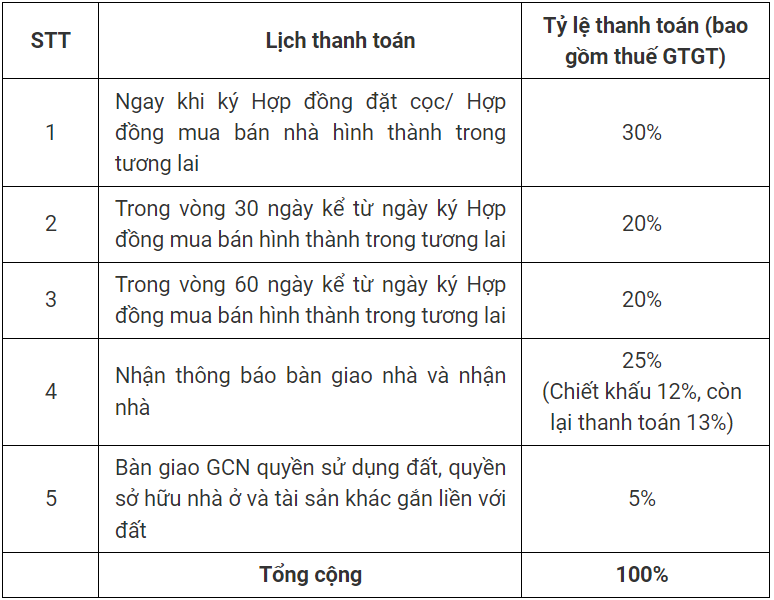 - Điều kiện áp dụng: Khách hàng phải thanh toán đúng thời hạn và đủ số tiền ở các đợt thanh toán bằng vốn tự có và nhận nhà theo tiến độ thanh toán sau: