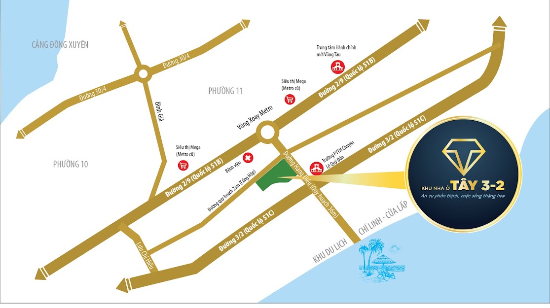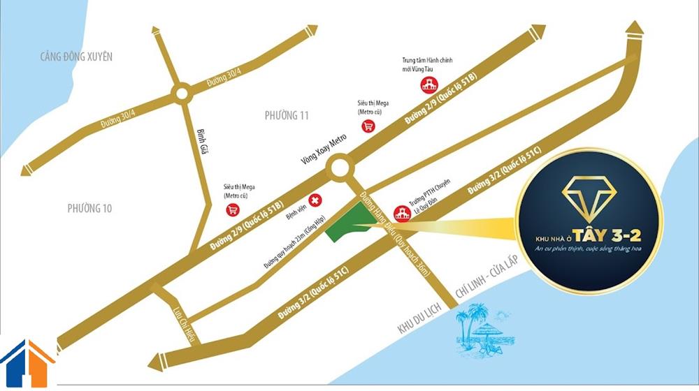 Dự án khu nhà ở Tây 3/2 Vũng Tàu nằm trên đường Hàng Điều, con đường kết nối hai đầu là đường Bình Giã và 3/2. Đây là hai cung đường lớn chạy song song và dọc hết thành phố Vũng Tàu. Chưa kể nó còn kết nối trực tiếp tới quốc lộ 51. Sau lưng dự án là bệnh viện đa khoa Vũng Tàu, phía trước là bãi biển Đồi Dương. Nói lên giá trị cũng như lợi thế vị trí khu nhà ở tốt đến mức nào. Chưa kể đây cũng là khu có dân cư đông đúc nhất TP.Vũng Tàu. Cung cấp nhiều tiện ích và nguồn “cầu “ các loại hình dịch vụ.