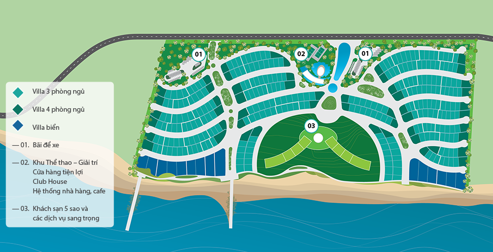 Trải dài trên diện tích 22ha, cùng với các Resort. Biệt thự lên đến 348 căn phòng diện tích trung bình mỗi Villas là 200m2. Đặc biệt là dãy biệt thự ngay mặt biển mang đến lợi nhuận nhiều nhất. Các khu vực được vây quanh trung tâm là những dịch vụ, tiện ích nội khu. Hệ thống đường nhựa hiện đại vươn đến mọi vị trí trên dự án. Nối liền mọi khu vực đảm bảo cho các khách hàng dễ dàng trải nghiệm các dịch vụ. Cũng như dễ dàng di chuyển đến các khu du lịch giải trí kế cận.