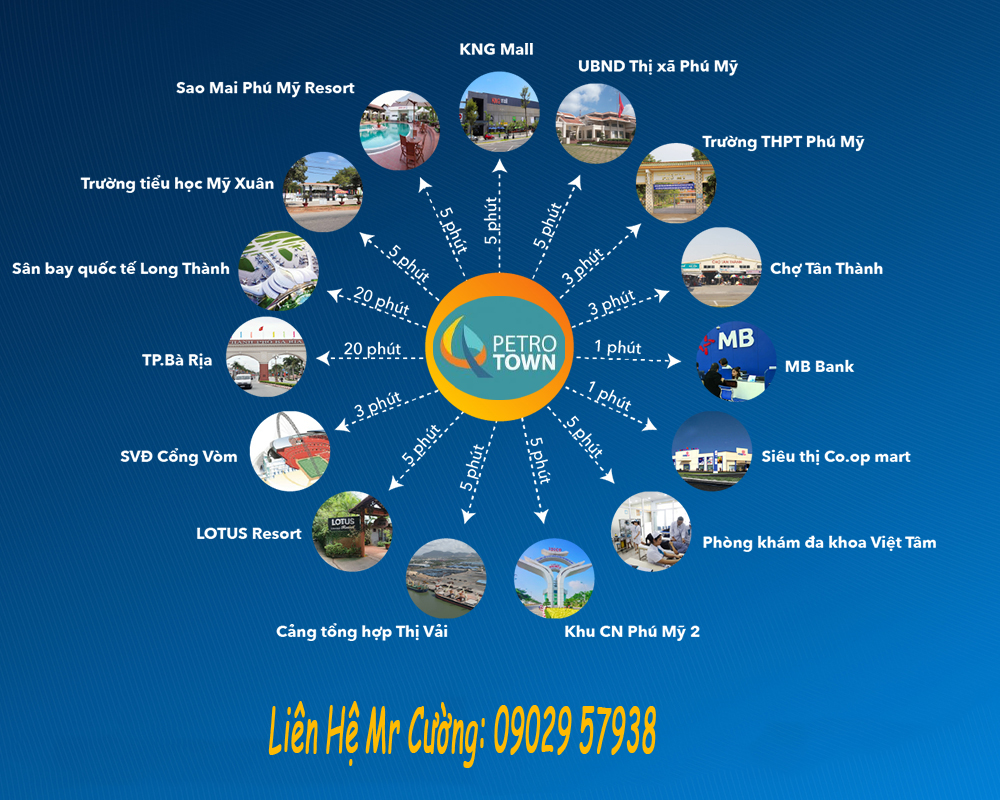 Với vị thế đắc địa ngay lòng trung tâm Phú Mỹ, từ Petro Town dễ dàng đến mọi khu vực tiện ích hàng đầu khu vực như: trung tâm hành chính UBND, Các cấp trường học, Chợ, Siêu thị KNG Mall, Khu nghĩ dưỡng,.. Chỉ với thời gian từ 2 đến 10 phút mà lại cực kì dễ dàng.