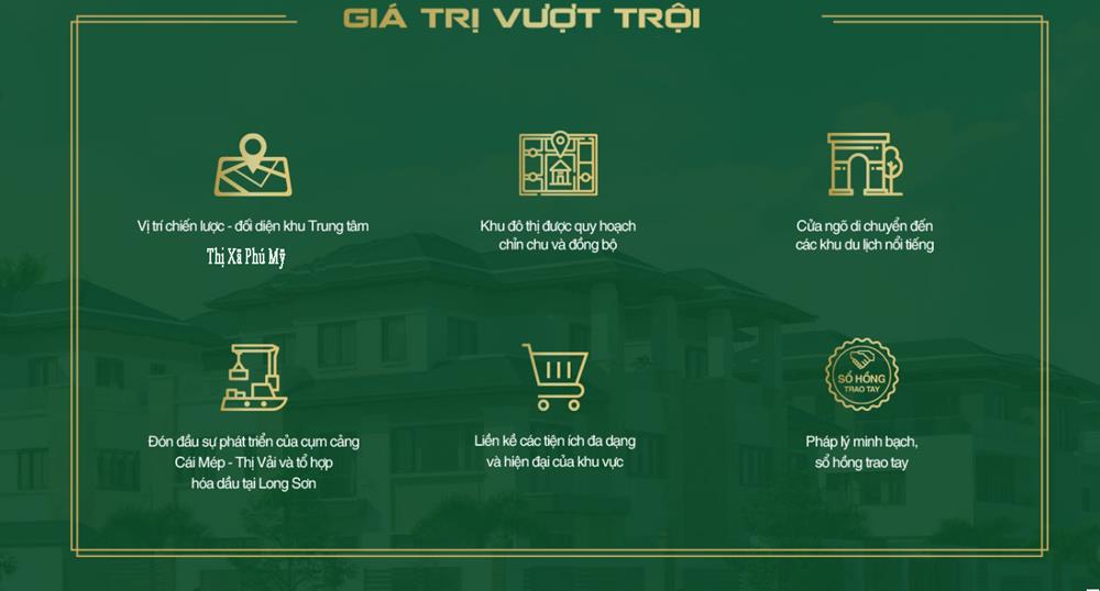 Toạ lạc tại trung tâm hành chính của Phú Mỹ, với vô số tiện ích ngoại khu, phục vụ mọi nhu cầu của người dâm. Ngoài ra việc các KCN, Cầu cảng, Sân bay Long Thành nổi lên thu hút nguồn vốn đầu tư FDI cực kì lớn.