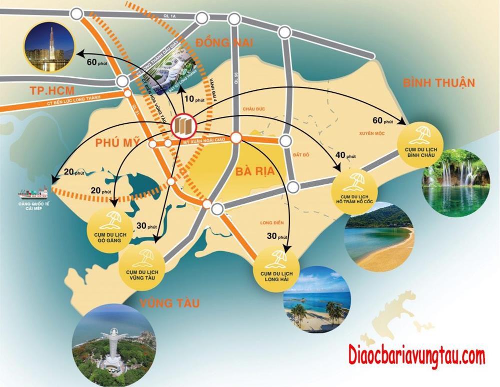 - Đến TP.Vũng Tàu 35km, Tp.Bà Rịa 20 km