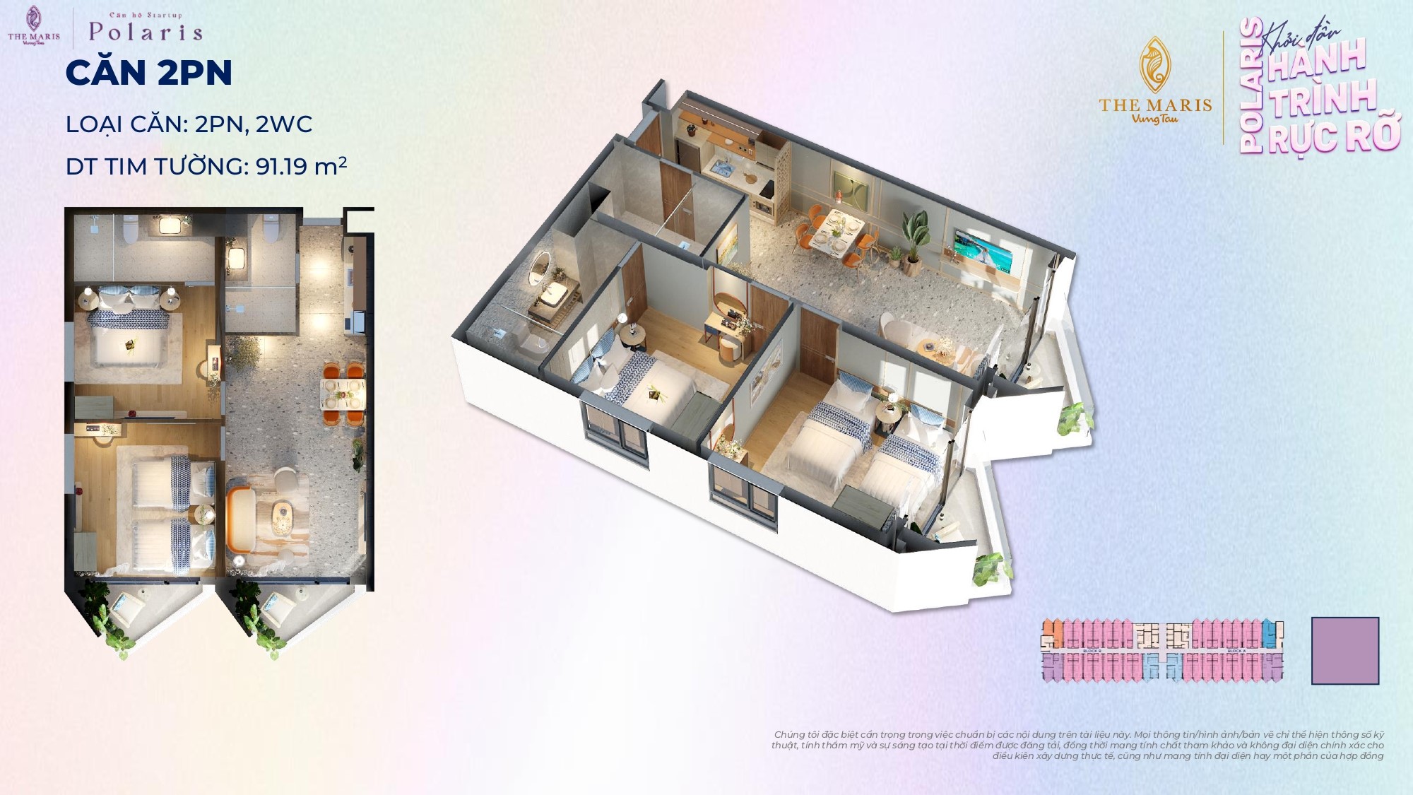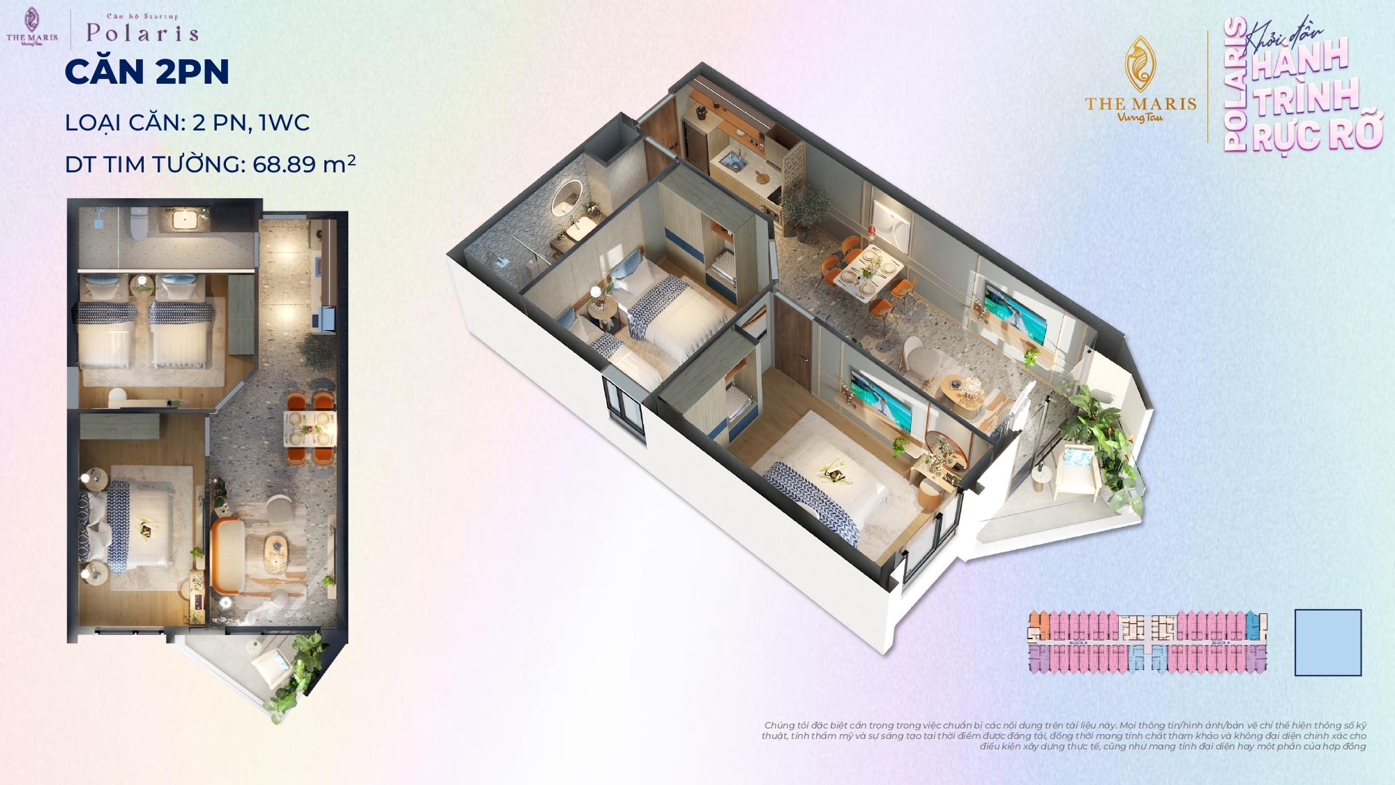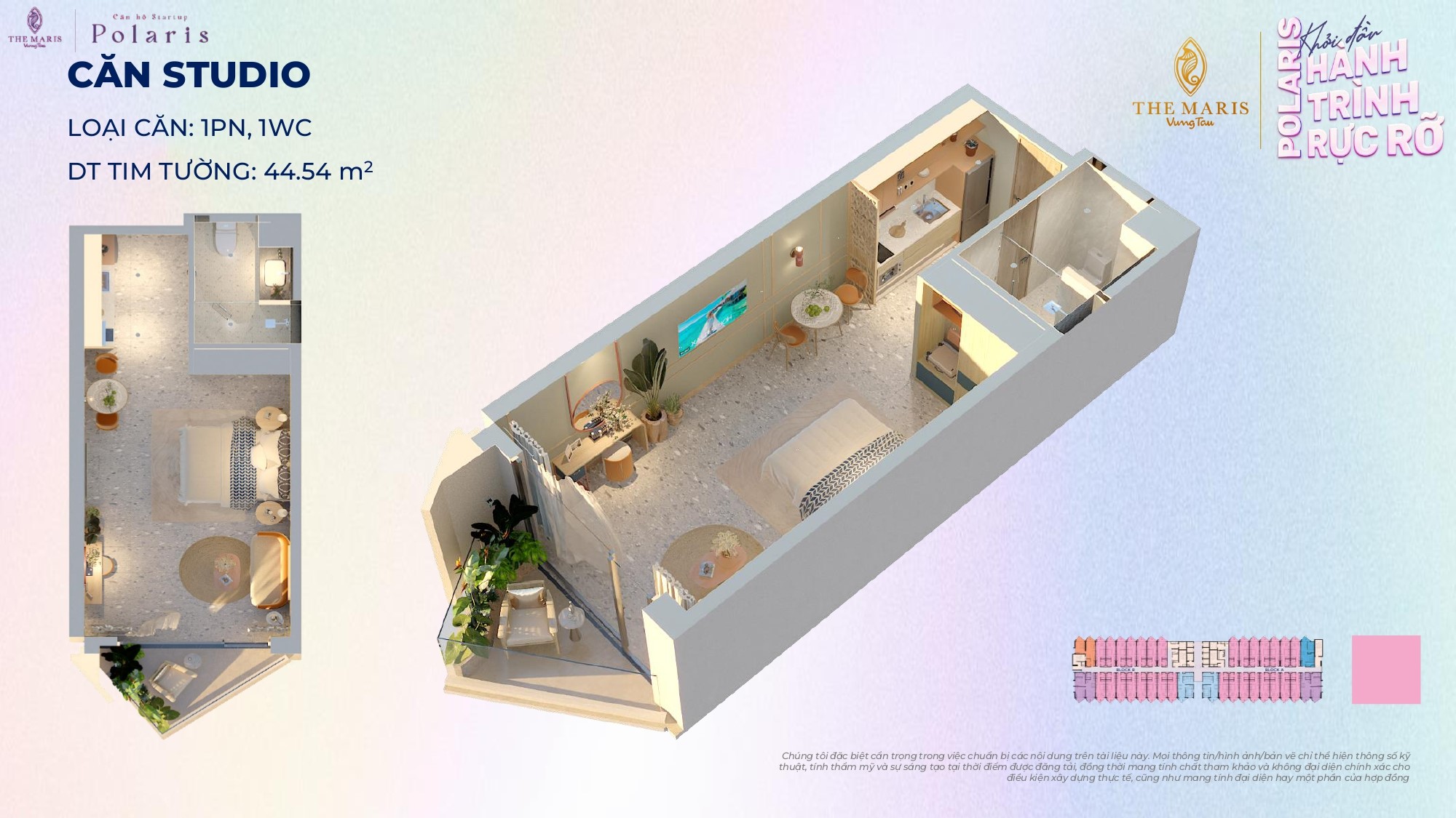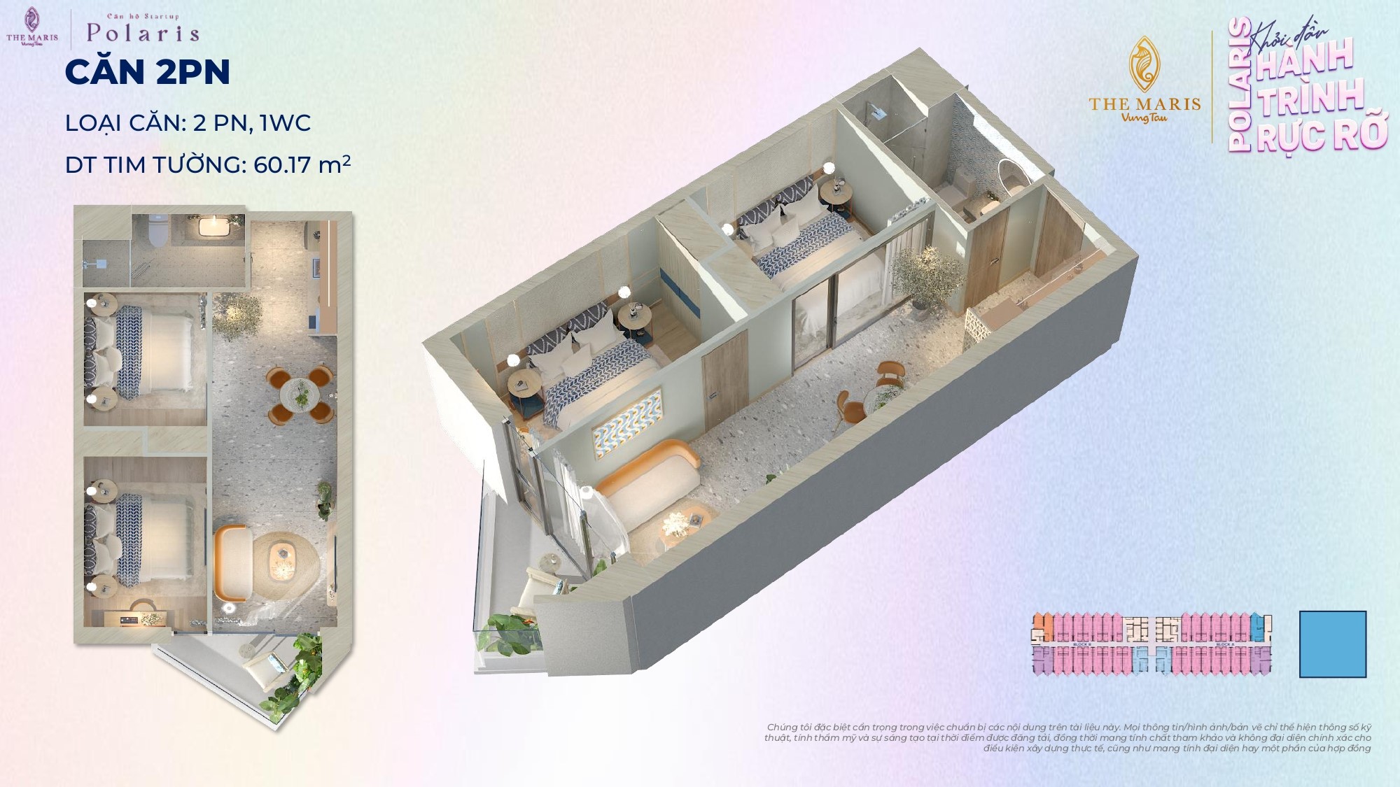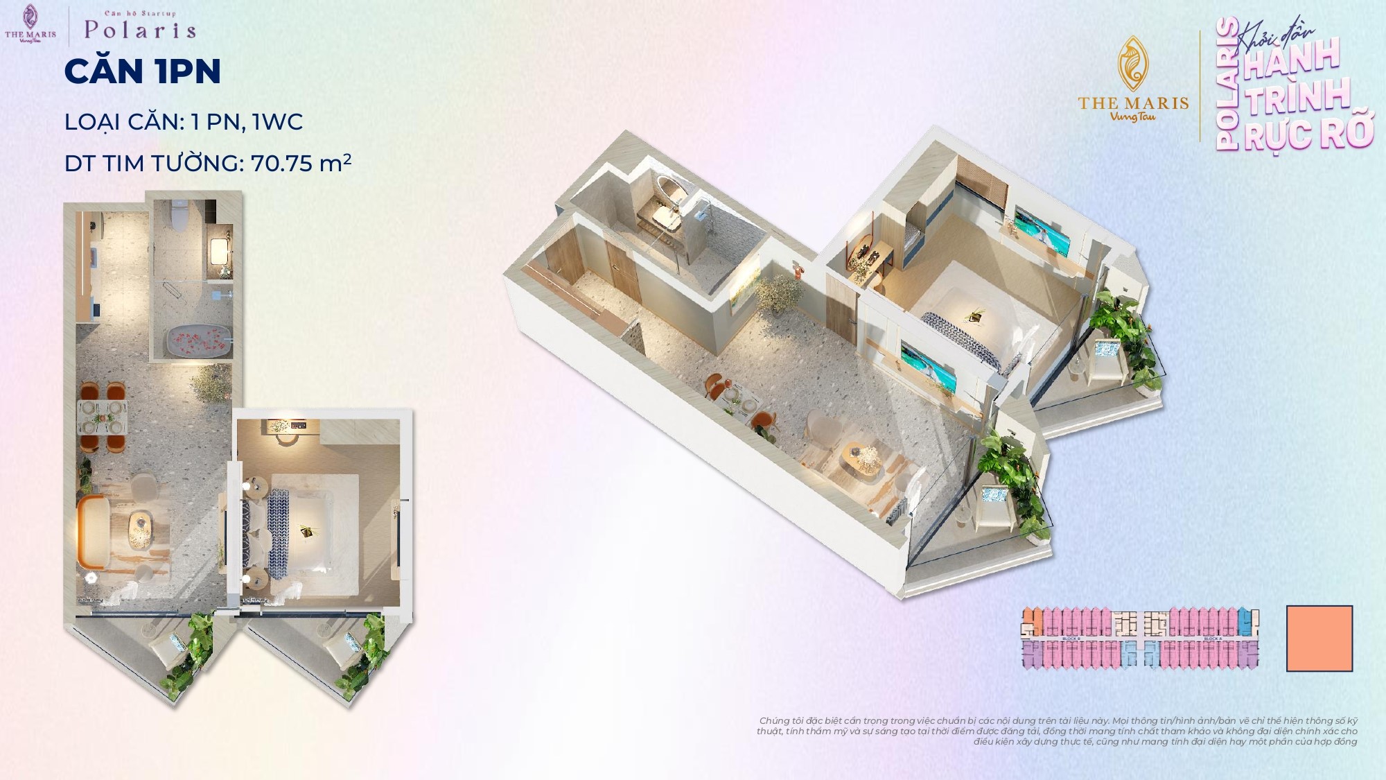 Tháp căn hộ Polaris của dự án The Maris Vũng Tàu có 2 loại thiết kế chính là 1PN và 2PN riêng biệt. Đặc biệt thiết kế căn hộ Polaris đều có tầm nhìn ôm trọn biển Chí Linh là một điểm cộng cho căn hộ nghỉ dưỡng.