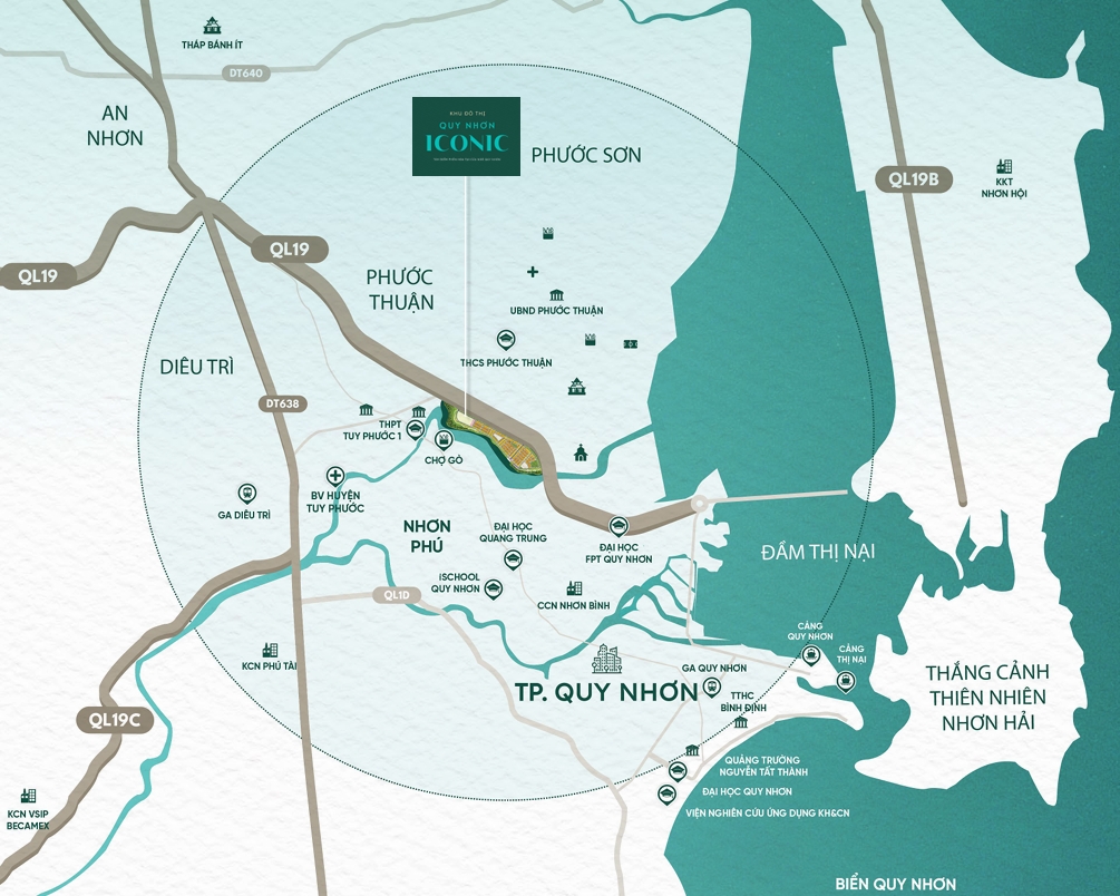 Dự án Quy Nhơn Iconic tọa lạc dọc theo trục quốc lộ 19 mới, thuộc địa phận xã Phước Thuận, huyện Tuy Phước, tỉnh Bình Định. Tuyến đường này đóng vai trò chiến lược khi rút ngắn quãng đường từ cửa ngõ cầu Bà Di (quốc lộ 1A) đến trung tâm thành phố Quy Nhơn. Đồng thời, quốc lộ 19 mới còn là tuyến giao thông huyết mạch, kết nối các tỉnh Tây Nguyên với thành phố biển Quy Nhơn sôi động.