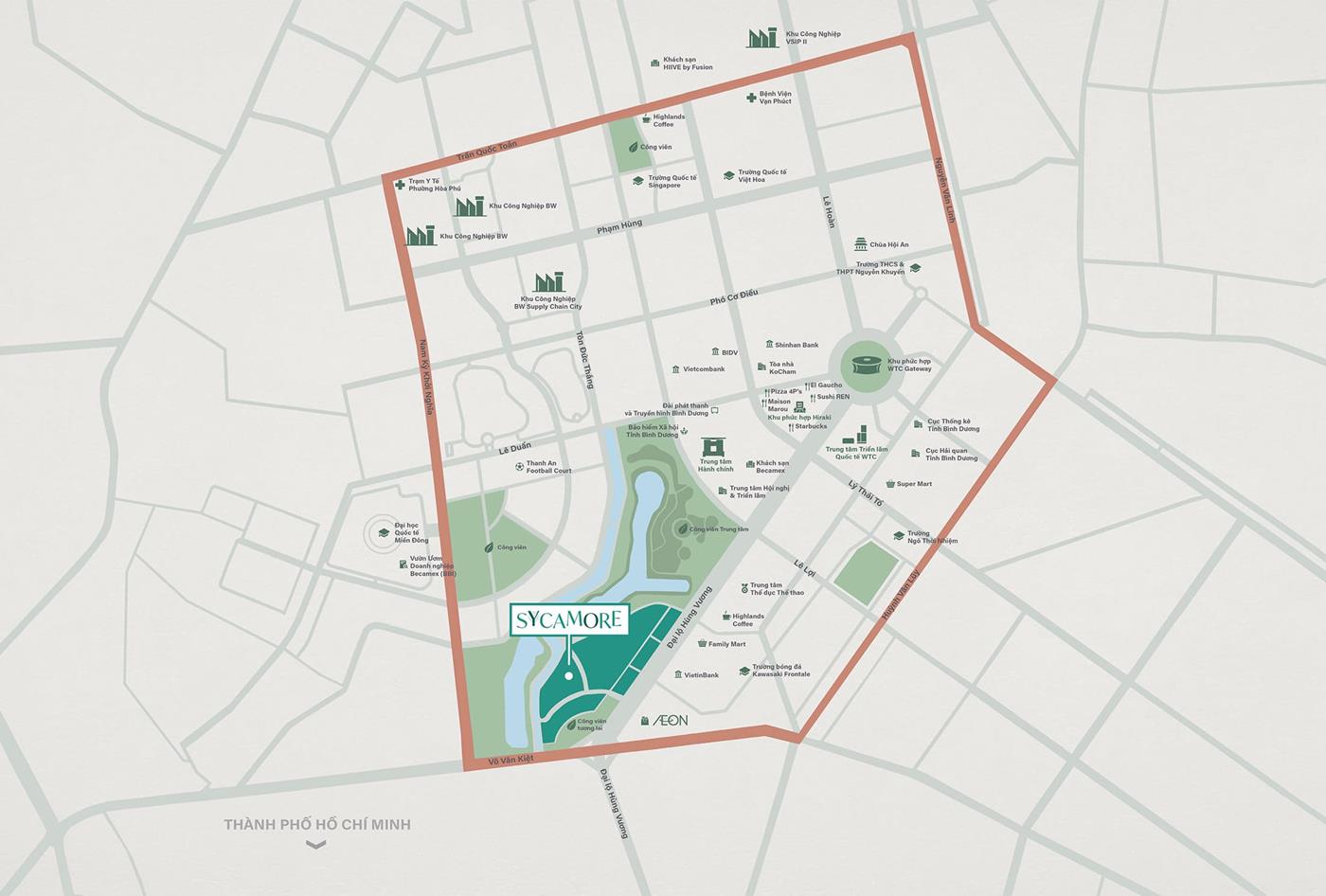 Vị trí Dự án Sycamore nằm nay Thành phố mới Bình Dương, mặt tiền Đại Lộ Hùng, Đường Hùng Vương, Phú Mỹ, Thủ Dầu Một, Bình Dương. Sycamore thuộc khu trung tâm thành phố mới Bình Dương, TP. Thủ Dầu Một, tỉnh Bình Dương. Dự án nằm ngay cạnh “lá phổi” của thành phố mới Bình Dương là công viên trung tâm rộng 700.000 m², cách Tòa nhà Trung tâm Hành chính tỉnh Bình Dương chỉ với 5 phút, cách trung tâm TP. Thủ Đức 40 phút và cách TP.HCM khoảng 60 phút.