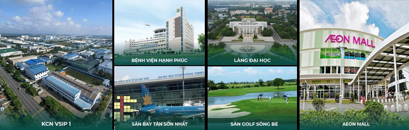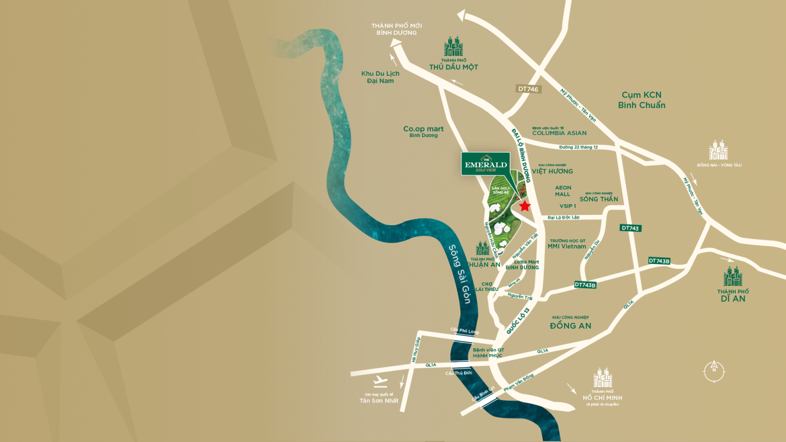 Ngoài ra, vị trí The Emerald Boulevard Dĩ An cũng chỉ cách sông Sài Gòn 350m và các công trình biểu tượng của khu vực như ngã tư Bình Phước – Thủ Đức (3 phút), sân golf Sông Bé, đại siêu thị AEON Mall, cổng chào Bình Dương (1km),..