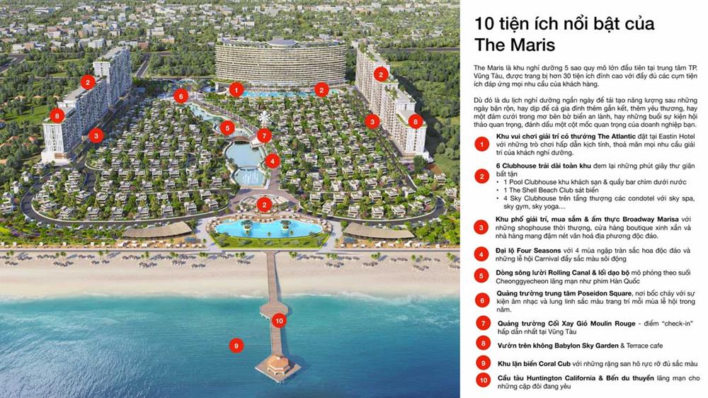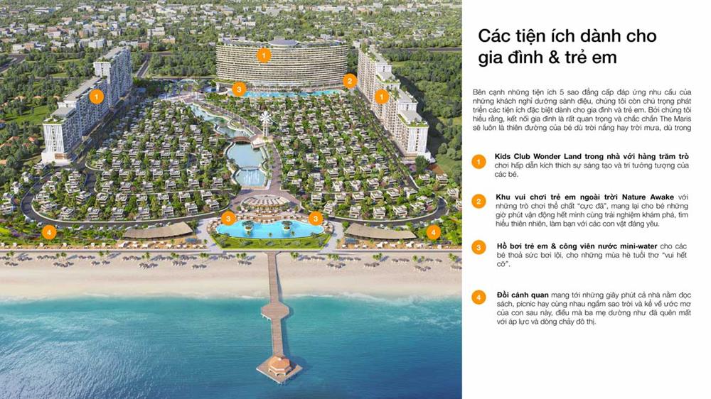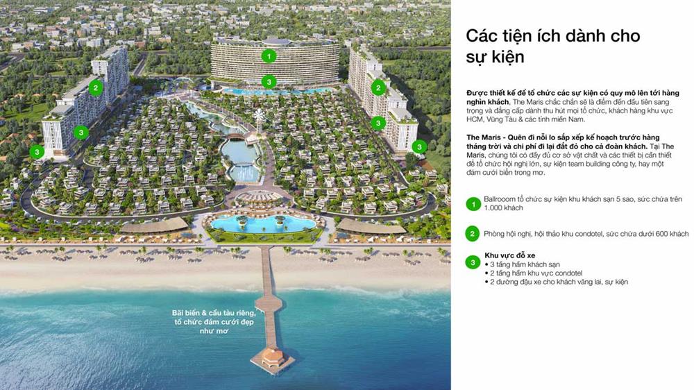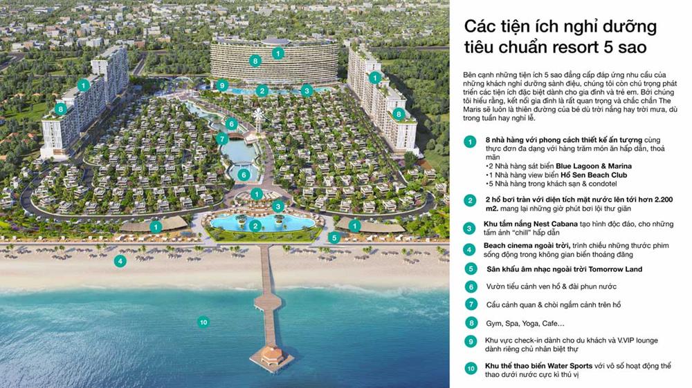 Dự án The Maris là một dự án nghỉ dưỡng đỉnh cao 5 sao, nơi đây không chỉ là khu du lịch đơn thuần. Mà nơi đây còn sẵn sàng cho những đoàn du lịch, đoàn thể lớn để có những hoạt động sự kiện lớn. Đa dạng loại hình cho mọi nhu cầu của các lứa tuổi.