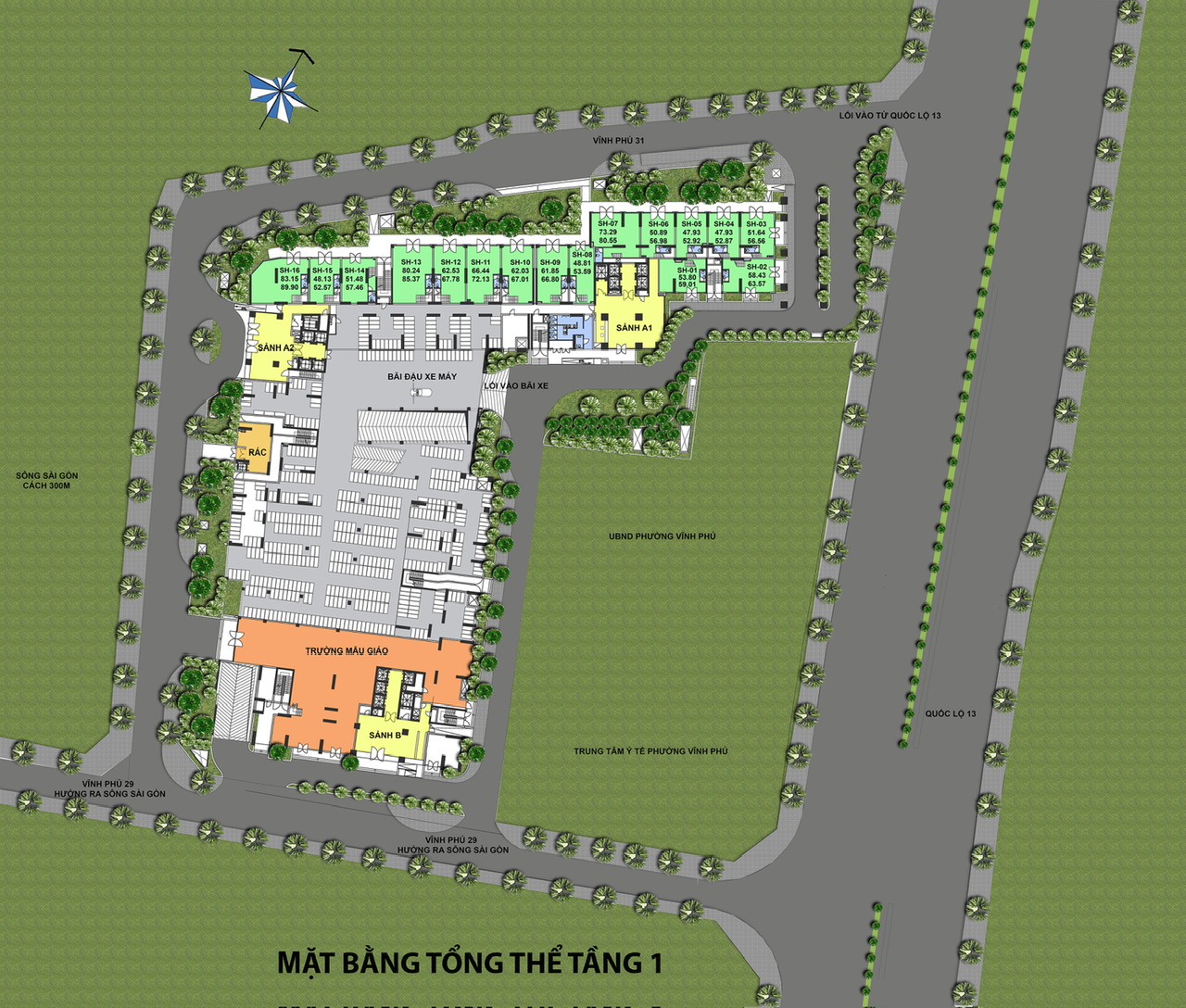 - 21 sân chơi cát, 22 BBQ, 23 Artwork, 24 hồ tiểu cảnh, 26 khu tập thể dục ngoài trời, 27 GYM, 28 trường mẫu giáo, 29 ATM, 30 công viên bờ kênh, 31, 32, 33 công viên dự án, 34 khu Drop OFF.
