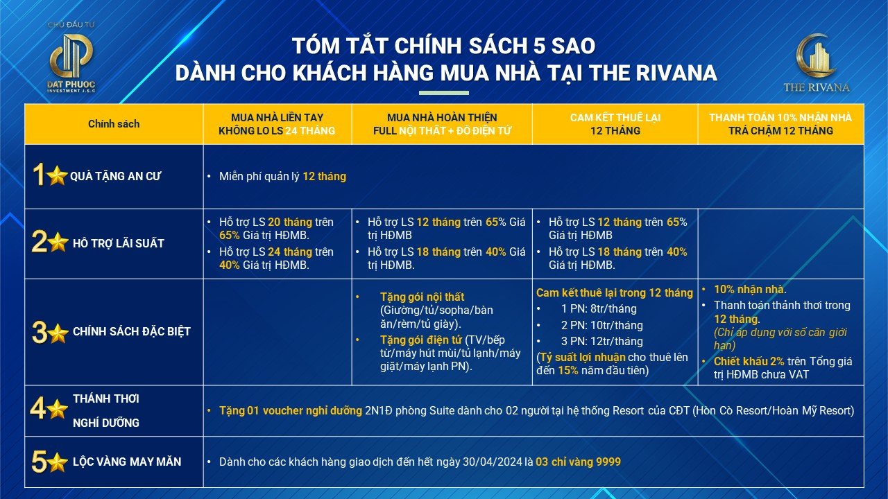 Những chính sách hấp dẫn giá bán được chủ đầu tư chung cư The Rivana đưa ra cho khách hàng khi sở hữu dự án.