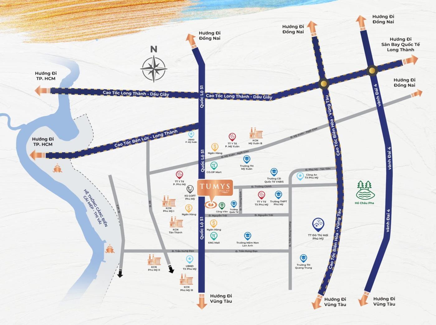 Đây là một vị trí vô cùng đắc địa làm cho dự án Tumys Homes Phú Mỹ đáng giá cho khách hàng mua ở cũng như đầu tư. Vừa có thể tiện lợi trong việc di chuyển vừa có tiềm năng tăng giá cao trong giai đoạn 1 mở bán sắp tới.