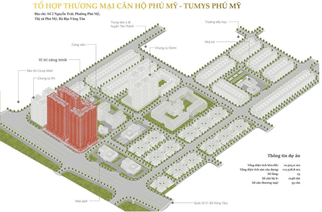 Tiếp nối sự thành công của căn hộ chung cư Osimi Phú Mỹ. Thị xã Phú Mỹ tiếp tục xây dựng chung cư Tumys Homes Phú Mỹ. Có vị trí vô cùng đắc địa tọa lạc tại trung tâm thị xã Phú Mỹ. Sẽ là nguồn sản phẩm dồi dào đáp ứng nhu cầu ở đầu tư cho khách hàng tại khu vực thị xã Phú Mỹ. Nơi mà có nguồn nhu cầu cực kỳ lớn và đang ngày càng tăng
