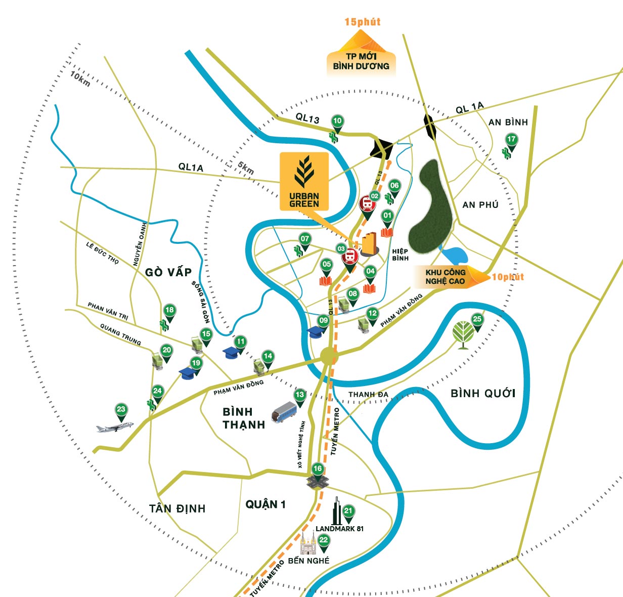 Xung quanh bán kính 5km của chung cư Urban Green Thủ Đức là các tiện ích ngoại khu công cộng hàng đầu của khu vực.