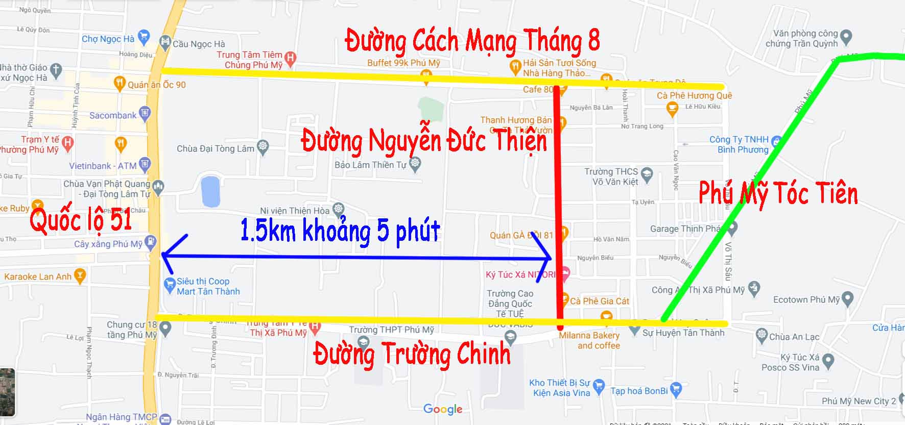 - Xung quang bán kính vài trăm mét có các quán café, nhà hàng, trường học, công an Phú Mỹ